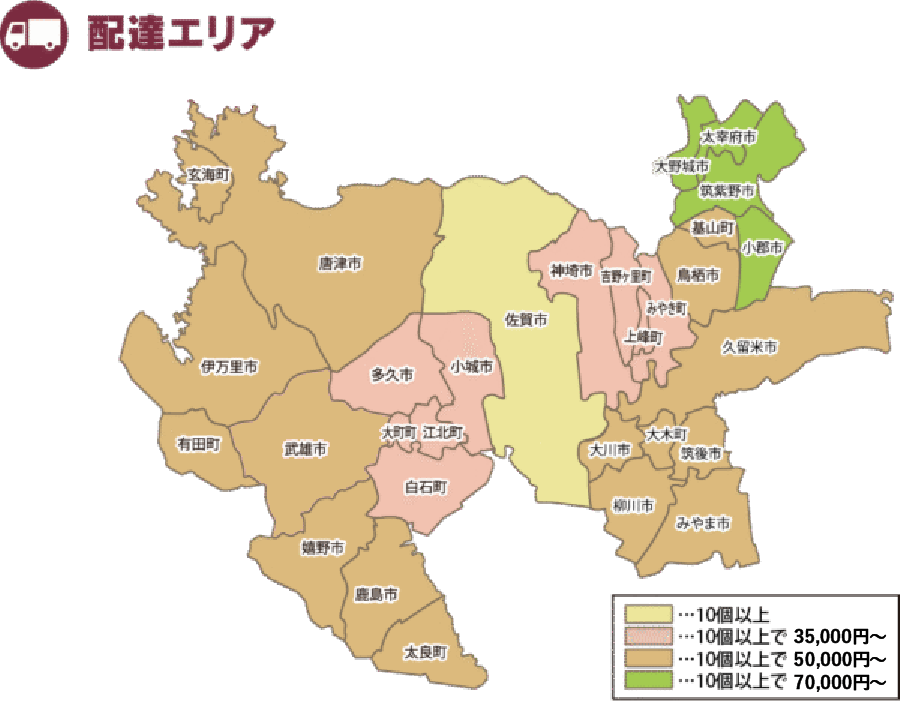 (配達は10個以上から佐賀市内、市外は10個以上かつ金額に応じてお届けいたします。下記のマップをご参照ください。9個までは店頭お渡しとなります。)