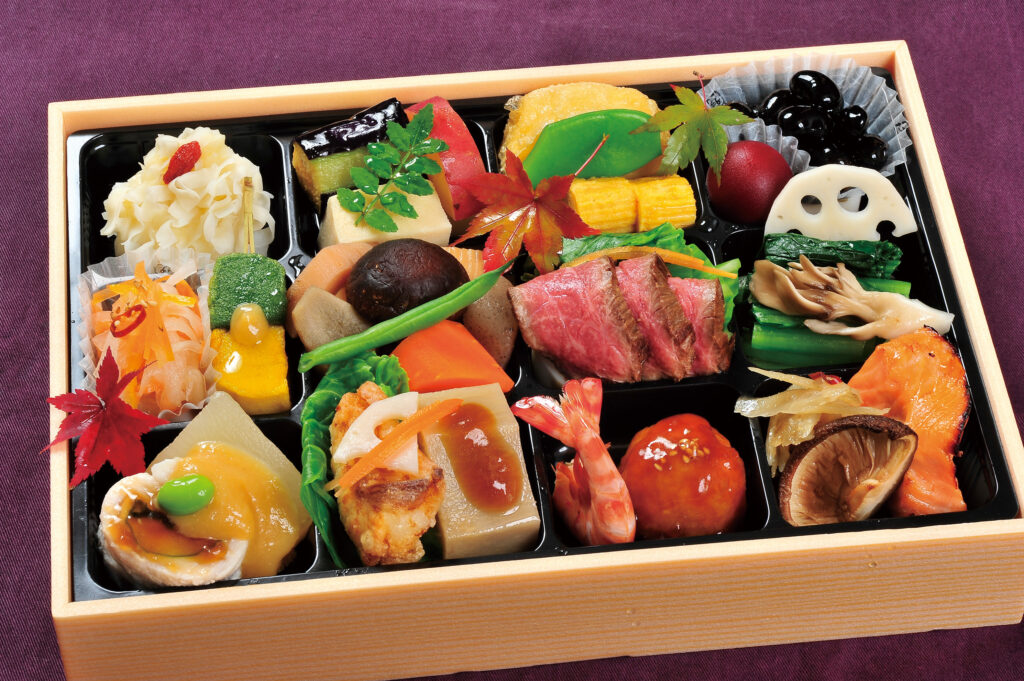 和牛ローストビーフ・河豚の揚げ煮・筑前煮・旬野菜のお浸し・サーモンの柚庵焼・生麩の田楽・出し巻き玉子・新丸十レモン煮・海老の艶煮・キャベツのマリネ・豚の胡麻しゃぶ・茄子の揚げ煮・ふろふき大根・旬野菜の煮物・高野豆腐・蓮根饅頭・真薯揚げ・豆腐のしゅうまい・季節のあしらい